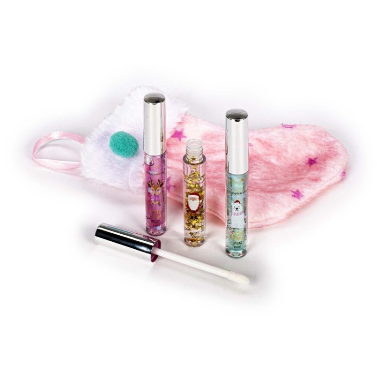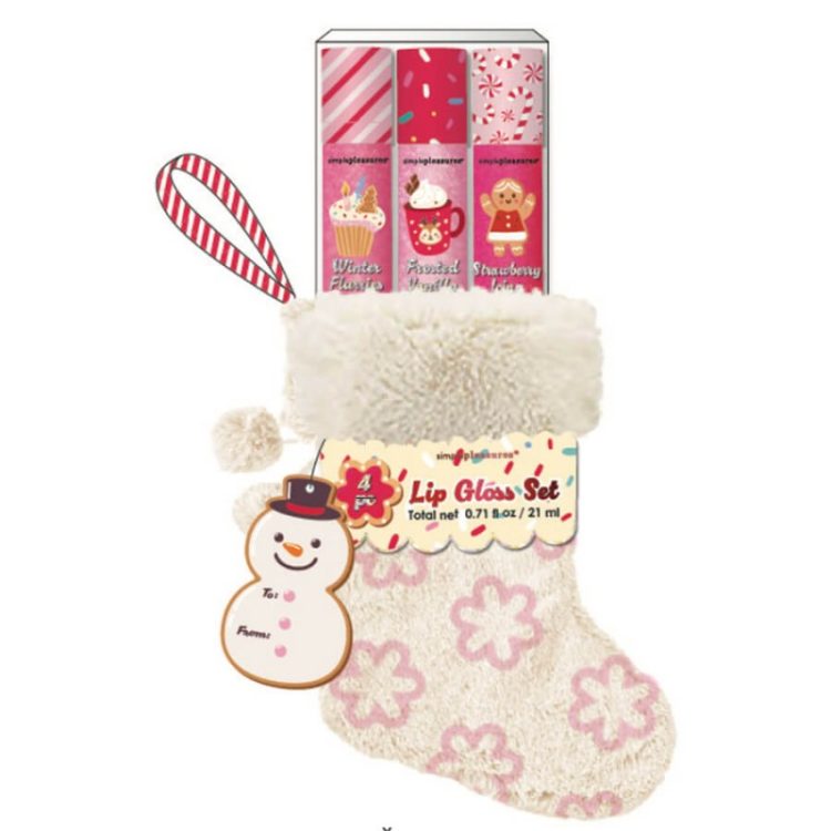 Coffret SUGAR FROSTED LAND (28x13x2 cm), senteur : Strawberry Icing/Frosted Vanilla/Winter Flurries. Contenu : chaussette de Noël + 3x7ml Lipgloss